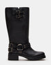 The ASTOR BLACK LEATHER WIDE CALF square toe boot features a slouchy mid-calf silhouette reinforced with strap accents and substantial buckle hardware. A wide sole with a block heel provides a solid foundation for this engineer-inspired design.
