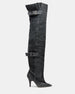 Expertly crafted. the BADDIE boot is both edgy and practical. Made with a pointed toe and buckle detail. these over-the-knee heeled boots offer a unique touch to any outfit. Elevate your style with these statement boots.