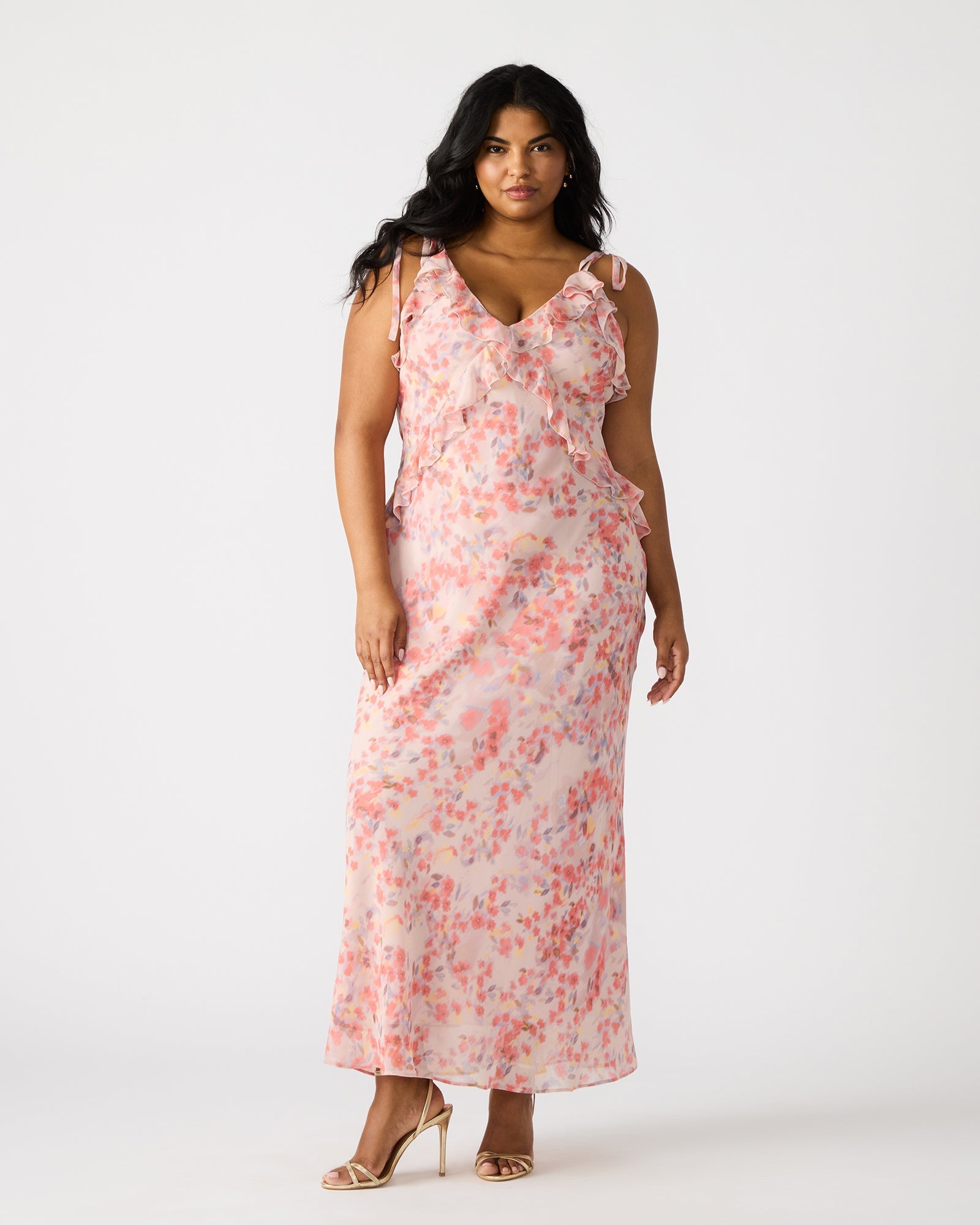 Be the center of attention in the stunning ADALINA dress. This dress features a v-neckline and ruffle detail that will make you stand out on any occasion. With its sleeveless design. this maxi dress is the perfect addition to your wardrobe.