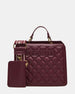 Clever interior organization and a matching pouch give the compact EVELYN BAG BLOODSTONE QUILTED surprisingly roomy storage. Reinforced edges. structured side gussets. and custom hardware add to the substantial look and feel of this top-handle design.