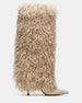 Experience sleek and edgy style with ICON. With a heeled stiletto and fold-over faux fur cuff. these knee-high boots are perfect for adding a touch of glam to any outfit. The pointed-toe design adds a chic touch. making these boots a must-have for any fashion-forward shoe lover.