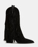 The LANDMARK BLACK SUEDE bootie showcases expert craftsmanship with a bold western influence. Featuring stylish fringe accents. stud detailing. and a cuffed silhouette. these booties offer a distinctive look. The pointed toe enhances their sleek profile. making them an ideal choice for those seeking a versatile blend of character and sophistication.