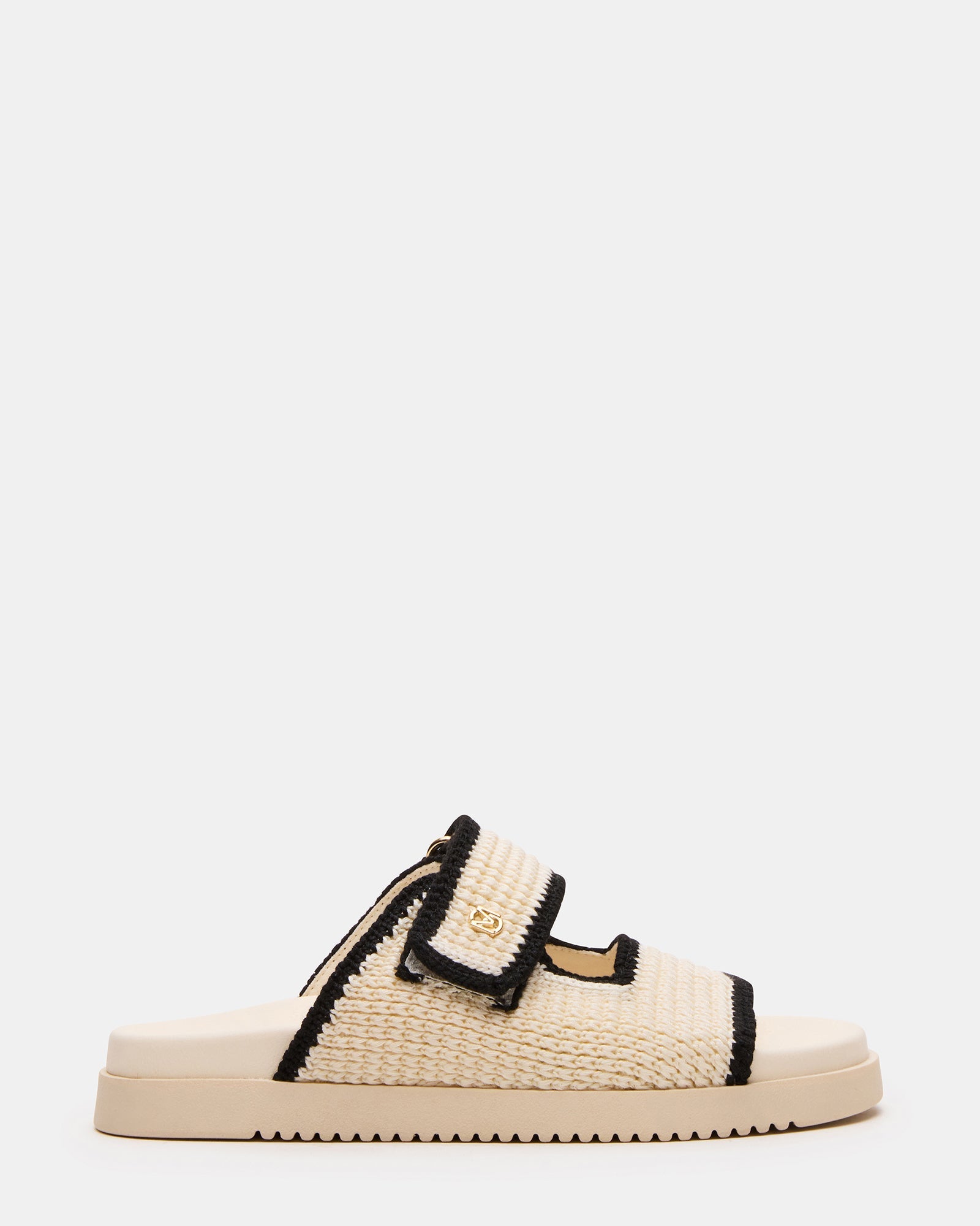 The MAYSIE CREAM MULTI sandal features a stylish woven design on a flatform footbed. offering both elevated style and support. Its trendy yet practical flatform sole provides steady balance. while the molded footbed ensures cushioning for all-day wear. Ideal for those seeking a blend of fashion and comfort in a versatile sandal.